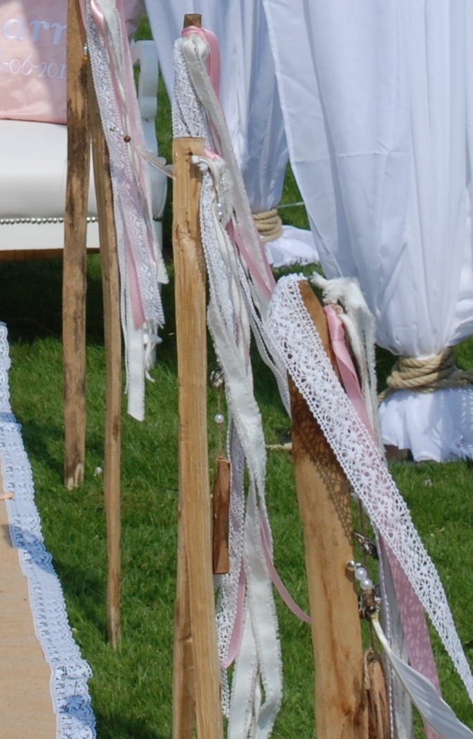 linten, veren, paaltjes, decoratie, bruiloft
